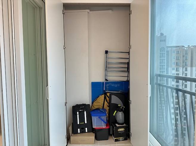 반대편에 있던 배관은 보기가 싫더라구요. 그래서 문만 달고 창고로 만들어 버렸습니다. 그리고 지금은 행거와 짐 카트, 텐트 등 큰 짐들을 보관중이랍니다.