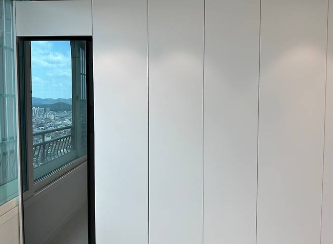 안방 베란다는 확장이 되어 있지 않았는데 창고 겸 취미 공간으로 활용하고자 저희도 따로 확장은 하지 않기로 했어요. 이 쪽 베란다도 샷시는 상태가 좋아서 별도 교체 없이 필름공사만 진행하기로 했습니다.