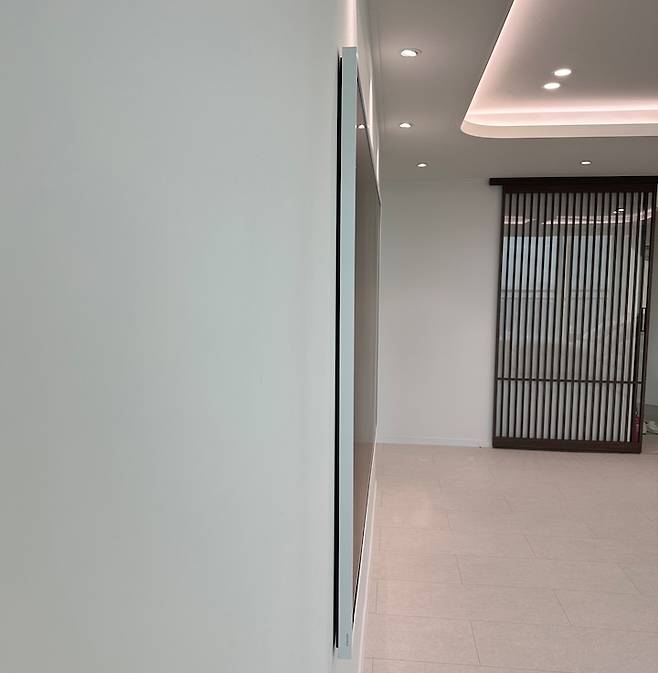 저희는 구매한 삼성 더프레임 TV의 특징을 더욱 살리기 위해 전문업체를 찾아 반매립 시공을 했어요. 벽에 착 달라 붙어서 정말 액자 같답니다.