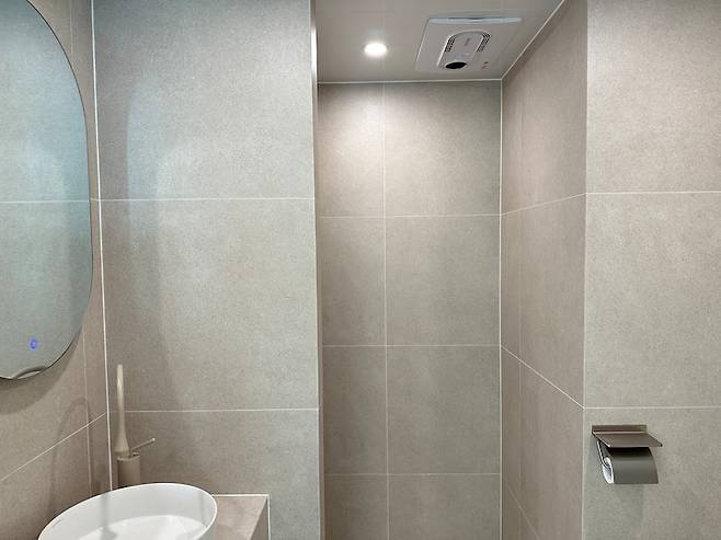 샤워실은 기존에 있던 유리 부스를 철거하고 가벽을 세웠어요. 사실 겉에서 보이는 만큼 샤워실 공간이 빠지진 않았거든요. 노린 건 아니지만 착시효과를 일으켜서 욕실이 더욱 넓어 보이는 효과를 얻었습니다.