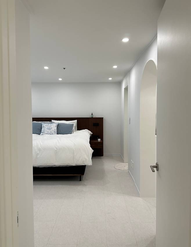 침실에는 아직 침대 외 다른 가전 가구는 들이지 않았어요. 침대 프레임은 제가 예전부터 마음 속에 두고 있었던 룸에이의 몰리 월넛 제품이에요.