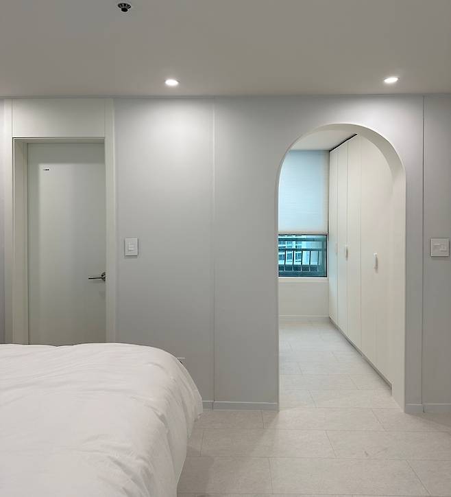 화장대 입구는 거실이나 보조주방과 다르게 완전히 둥근 아치형으로 만들었어요. 기존처럼 화장대가 벽 앞으로 튀어나오지 않게 가벽을 세웠습니다.