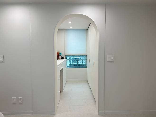 보조 주방 문은 아예 떼어버려서 오픈된 공간으로 만들었어요. 덕분에 주방은 개방감 있고 더욱 넓은 공간이 되었구요. 입구는 거실과 통일감 있게 모서리만 둥근 형태의 아치게이트로 포인트를 주었답니다.