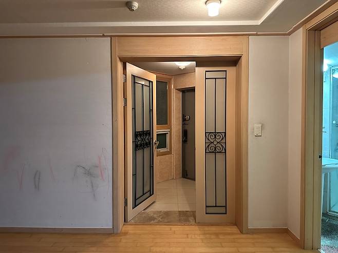 기존 중문은 두꺼운 몰딩의 양문형 여닫이 형태로 옛날 집이 떠오르는 무늬의 중문이었어요. 문을 당겨서 여는 형태라서 문이 신발장을 침범해 신발장에 신발 놓을 공간도 애매했습니다.