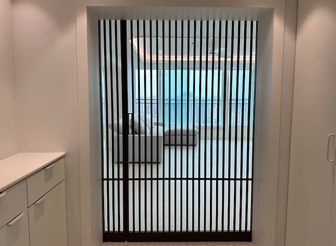 간살 사이 사이는 투명 유리로 중문 안팎에서 거실이나 신발장이 보이게 만들었어요. 그래서 집이 좀 더 개방적으로 느껴지는 효과가 있습니다.