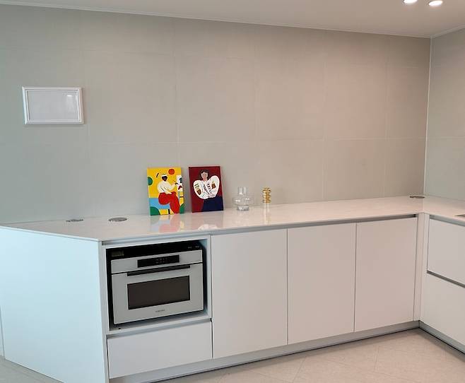 아트월은 모두 철거하고 매립선반까지 철거하며 가벽을 세웠어요. 확실히 단순한 하얀 벽지로 메꾸니 훨씬 깔끔해 졌습니다. 인터폰과 보일러 조절기, 스위치도 하얀색으로 교체했어요. TV 프레임도 하얀색으로 맞췄습니다.