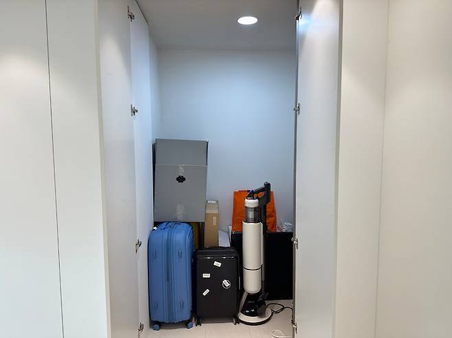 붙박이장의 비밀 중 하나는 창고가 있다는 점인데요. 기존 붙박이장을 철거하고 안으로 움푹 들어간 부분에 문만 달아서 창고처럼 활용 중이에요. 겉에서 봤을 때는 붙박이장처럼 보여서 누구도 창고라고 생각하진 않아요. ㅎㅎ 캐리어나 큰 짐들을 두고 있는데 특히 처음 입주했을 때 큰 가전이나 소품 택배들이 정말 많았어서 보관하기 용이했습니다.
