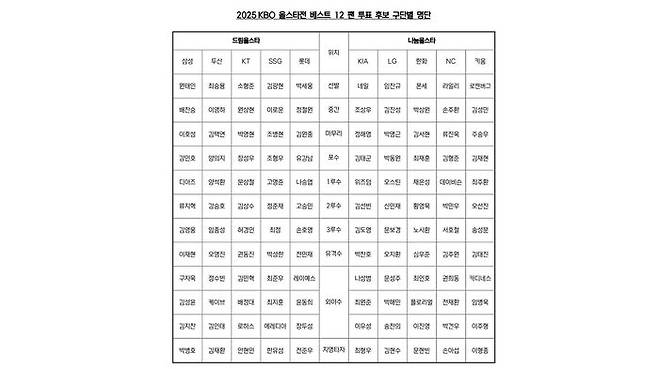 ▲ 2025 KBO 올스타전 베스트12 팬 투표 후보 구단별 명단