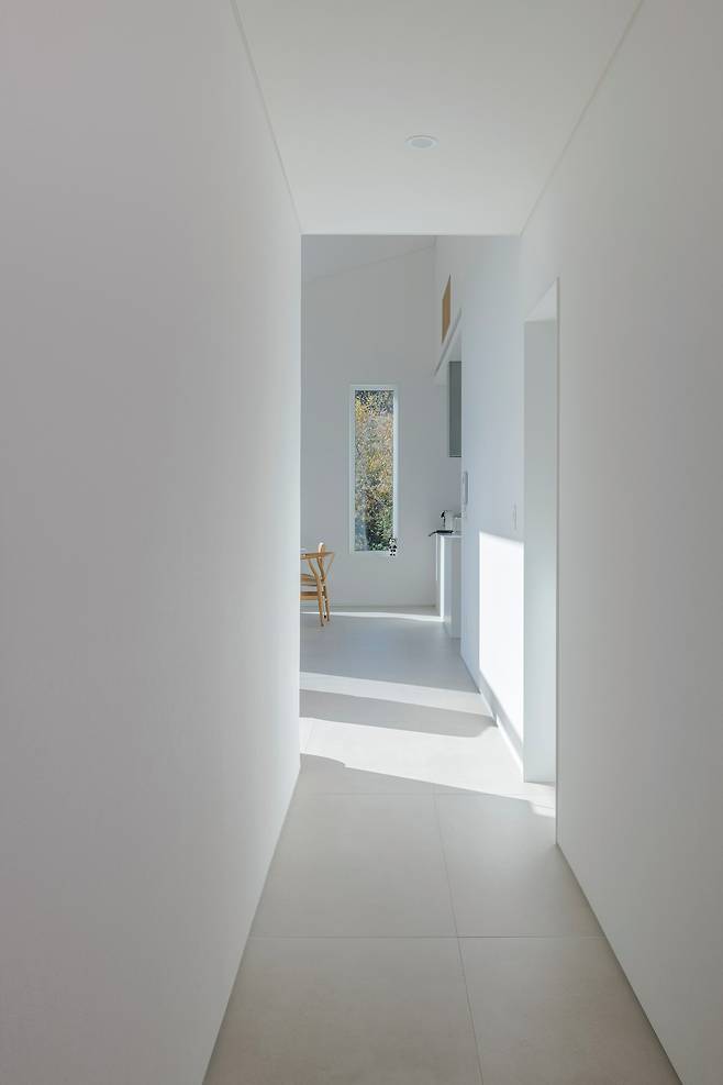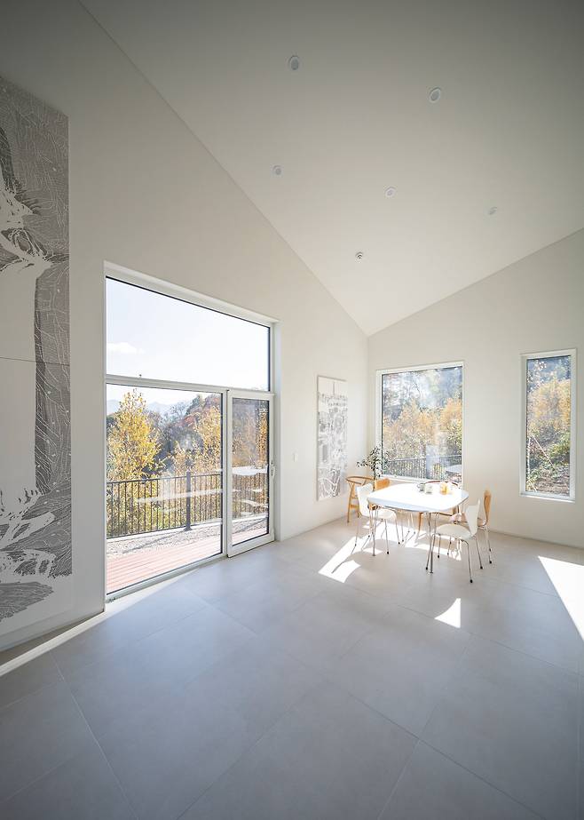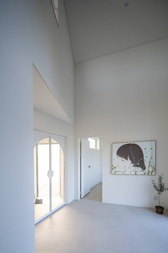 건축주 부부는 생활보다는 작업이 우선되는 직업이었기에 10년 넘게 작업실을 따라 이사를 다녔다고 했다. 그런 두 사람이 이번 집짓기에서 우선했던 것은 바로 ‘그림’이었는데 집을 주거동과 작업동으로 나눠 주거동은 전시장으로 사용할 수 있도록 지어 달라고 덧붙였다. 그 요구를 반영해 실내는 각종 그림을 걸 수 있도록 다양한 크기의 벽으로 채웠다. 게다가 그림 촬영을 위해 최소화한 콘센트는 전부 무광으로 계획하고, 어디든 그림을 걸 수 있도록 실내 벽을 보강했다. 아울러 다양한 각도와 크기를 가지는 벽과 높은 층고로 공간의 답답함을 덜었다. 이로써 갤러리 같은 집이 탄생했다.