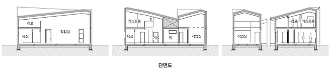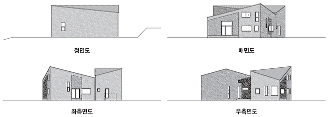 땅을 사용하는 배치와 여러 계획안이 있었는데 오히려 그중에 선택하지 않으셨으면 하는 안을 마음에 들어 했다. 우리는 도로를 등진 ‘ㄴ’자 형태로 배치하고 안마당으로 주변 풍광을 끌어오는 방식을 제안했는데 건축주는 안마당으로 진입하는 방식을 좋아하신 것이다. 장단점이야 있겠지만 예술가들의 시선과 충돌하는 건축가의 시선을 지속적으로 해결해 가며 설계를 진행해야만 했다.