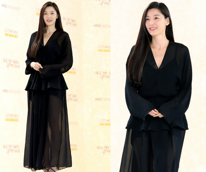 최근 전지현은 블랙 시스루 드레스를 입고 화려한 스타일을 뽐냈습니다. 깊게 파인 브이넥과 페플럼 장식이 돋보이는 시스루 드레스는 그녀의 청순하면서도 세련된 이미지를 강조했습니다. 10㎝가 넘는 하이힐을 신어 매력적인 각선미를 드러내며, 긴 생머리를 자연스럽게 풀어낸 전지현은 그야말로 여신 같은 매력을 발산했습니다.