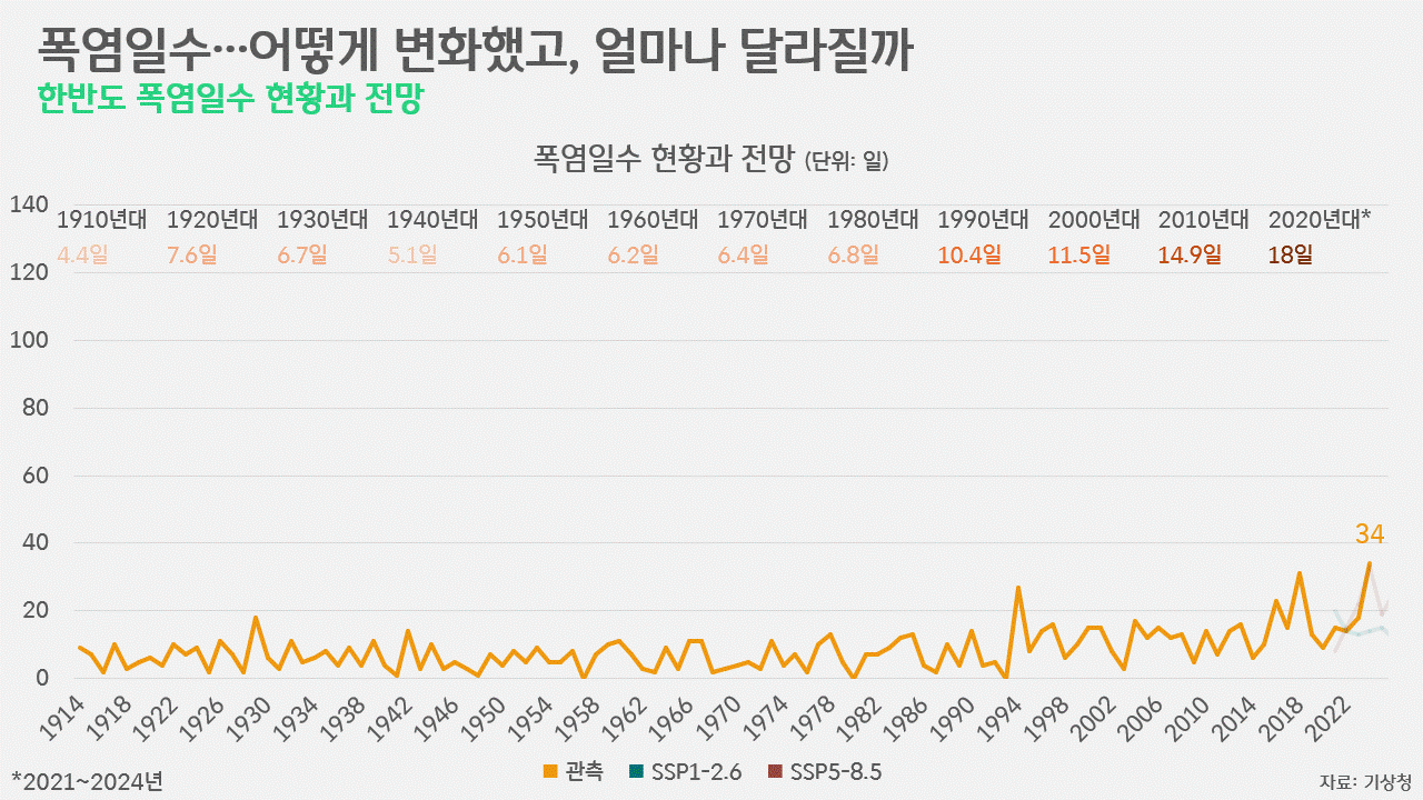 그럼, 앞으로 우리의 여름은 어떻게 달라질까. 관련 기록이 존재하는 1914년부터 현재까지의 관측값과 즉각적인 기후변화 대응에 최선을 다하는 상황을 상정한 SSP1-2.6 시나리오와 별다른 노력을 기울이지 않는 상황을 가정한 SSP5-8.5 시나리오를 함께 살펴봤습니다.