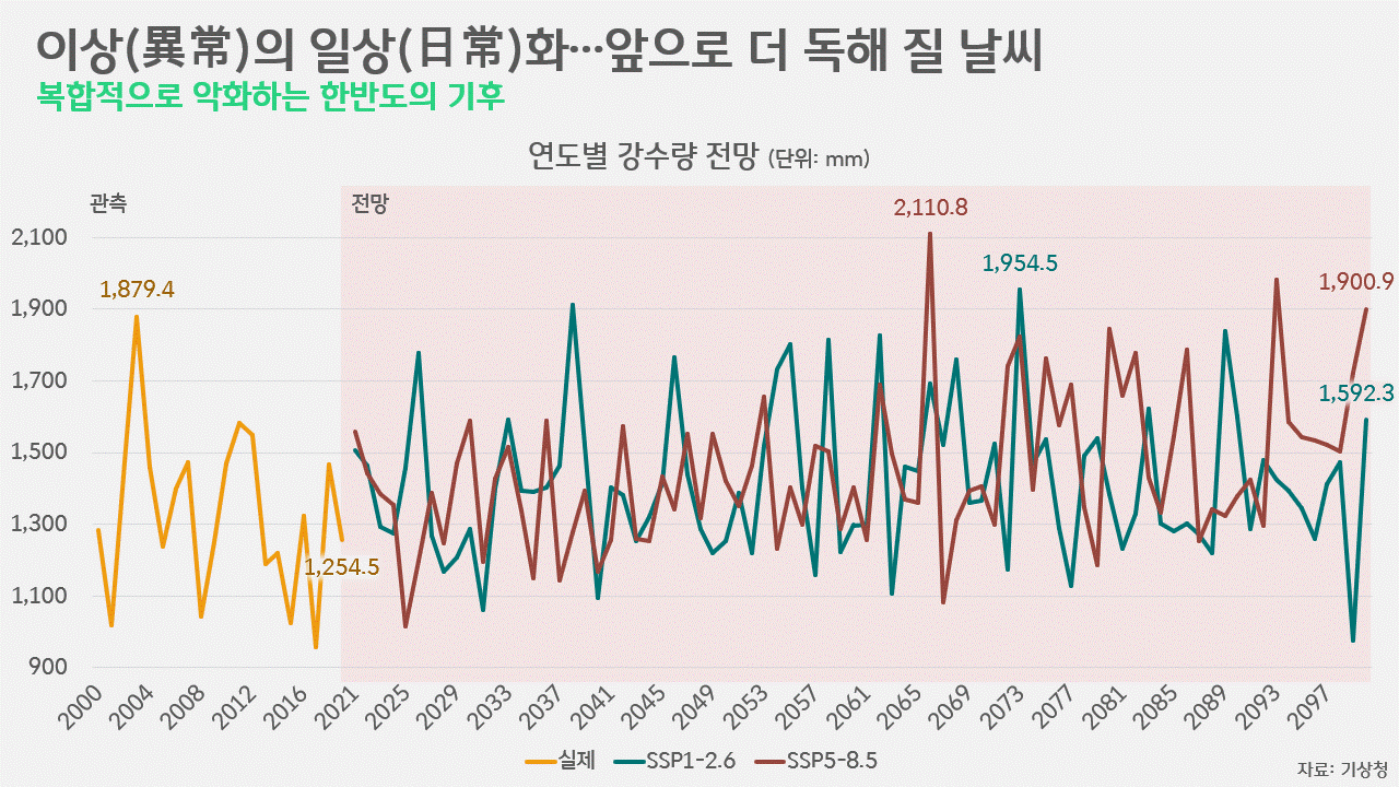 이러한 변화들로 예측할 수 있는 미래는 어떤 모습일까요. 고온과 호우, 가뭄 지수의 증가는 곧 인명피해의 증가와 사회경제적 피해의 증가를 의미합니다. 온열질환자의 증가는 물론, 고온과 호우, 가뭄이 한 해에 복합적으로 발생하면서 나타나는 재해재난은 산사태와 홍수, 침수, 산불에 그치지 않고 작물의 작황 악화와 농축수산물 생산량의 급감이라는 결과로도 이어집니다. 말 그대로 '먹고 살기' 힘들어지는 앞날이 펼쳐지는 것이죠.