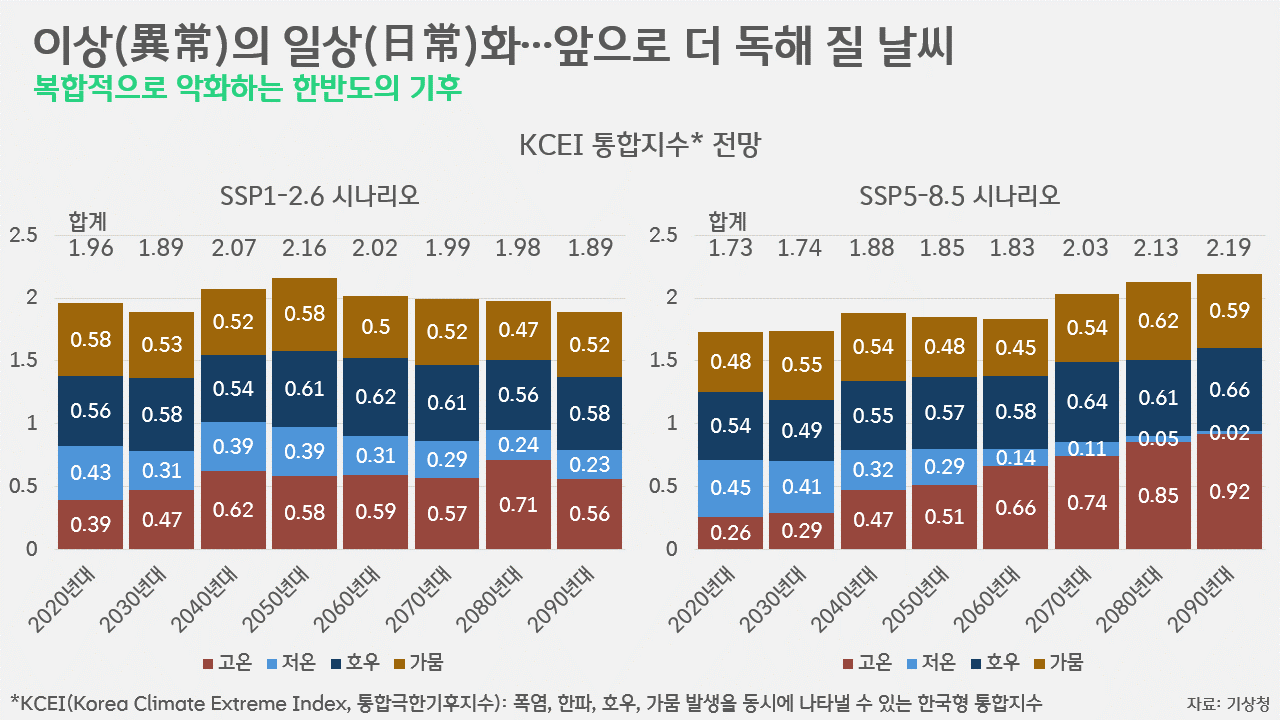 기후변화에 대응하지 않고, 지금처럼 별걱정 없이 온실가스를 계속해서 배출할 경우, KCEI 값은 계속해서 늘어나 2090년대 최대 2.19를 기록할 전망입니다. 반대로 당장의 대응 노력을 기울일 경우, 이 값은 2050년대 2.16을 정점으로 감소세로 돌아서 2090년대엔 1.89로 현재와 비슷한 수준까지 낮아질 것으로 예상됐습니다.