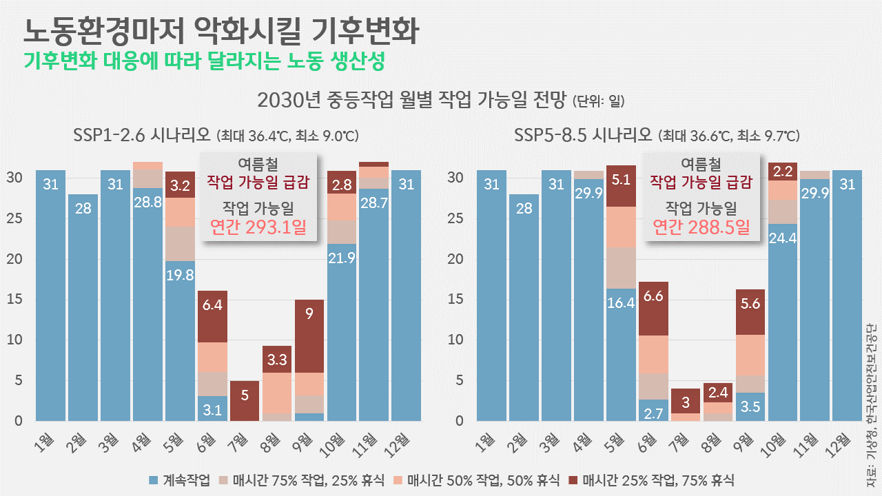 당장 기후변화 대응에 적극 나선다고 하더라도, 2030년 한여름엔 정상적인 중등작업이 불가능한 것으로 나타났습니다. 7월의 작업 가능일수는 단 5일로, 이 5일의 시간마저 15분 근무-45분 휴식을 취해야 하는 상황인 겁니다. 이때 연간 총 작업 가능일수는 293.1일로, 기후변화 대응에 나서지 않는 경우 연간 총 작업 가능일수는 288.5일로 더 줄어듭니다. 지금으로부터 25년 후인 2050년, 기후변화 대응에 나선다 하더라도 여전한 온난화로 8월 한 달은 중등작업 자체가 불가능해집니다. 연간 총 작업 가능일수는 278.4일로 줄어들게 되고요. 기후변화에 아무런 대응을 하지 않는 경우, 연간 총 작업 가능일수는 278.6일로 소폭 많은 것처럼 보이나 7~8월엔 '15분 작업-45분 휴식'이 아니고서는 작업이 불가능합니다.