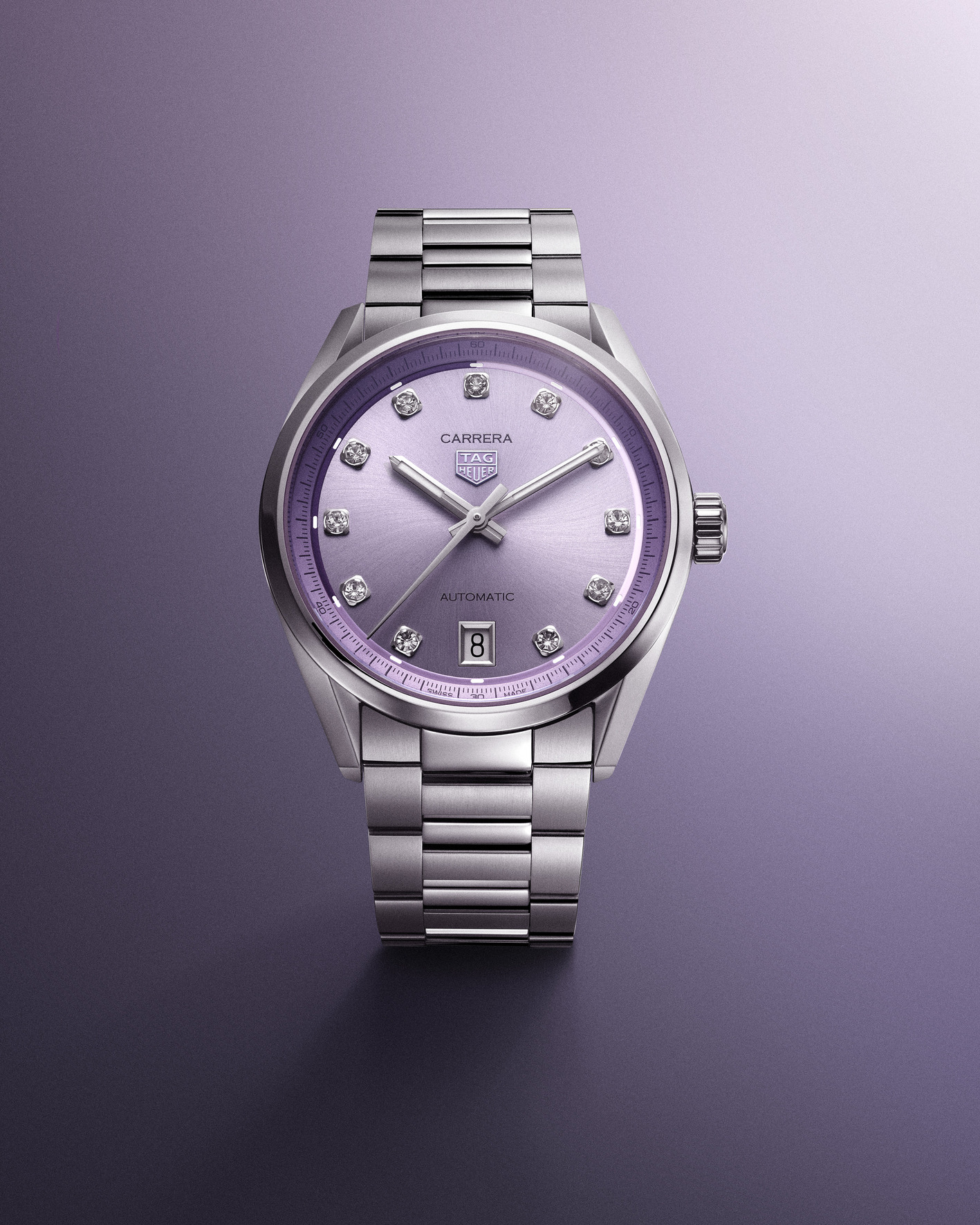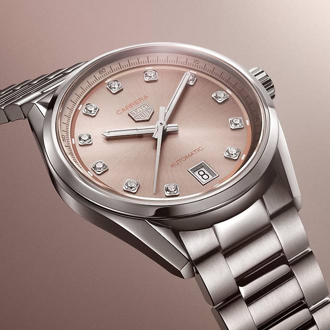 까레라 데이트 컬렉션이 부드러운 파스텔 컬러를 입었다. 파우더리 핑크와 라일락 컬러로 출시하는 케이스 지름 36mm 모델 2종은 기존 태그호이어 까레라 라인업에 세련되고 경쾌한 감각을 더하며 고객들에게 새로운 선택지를 열어준다. 각각 선레이 브러시드 다이얼과 스네일 브러시드 다이얼을 적용한 결과물.