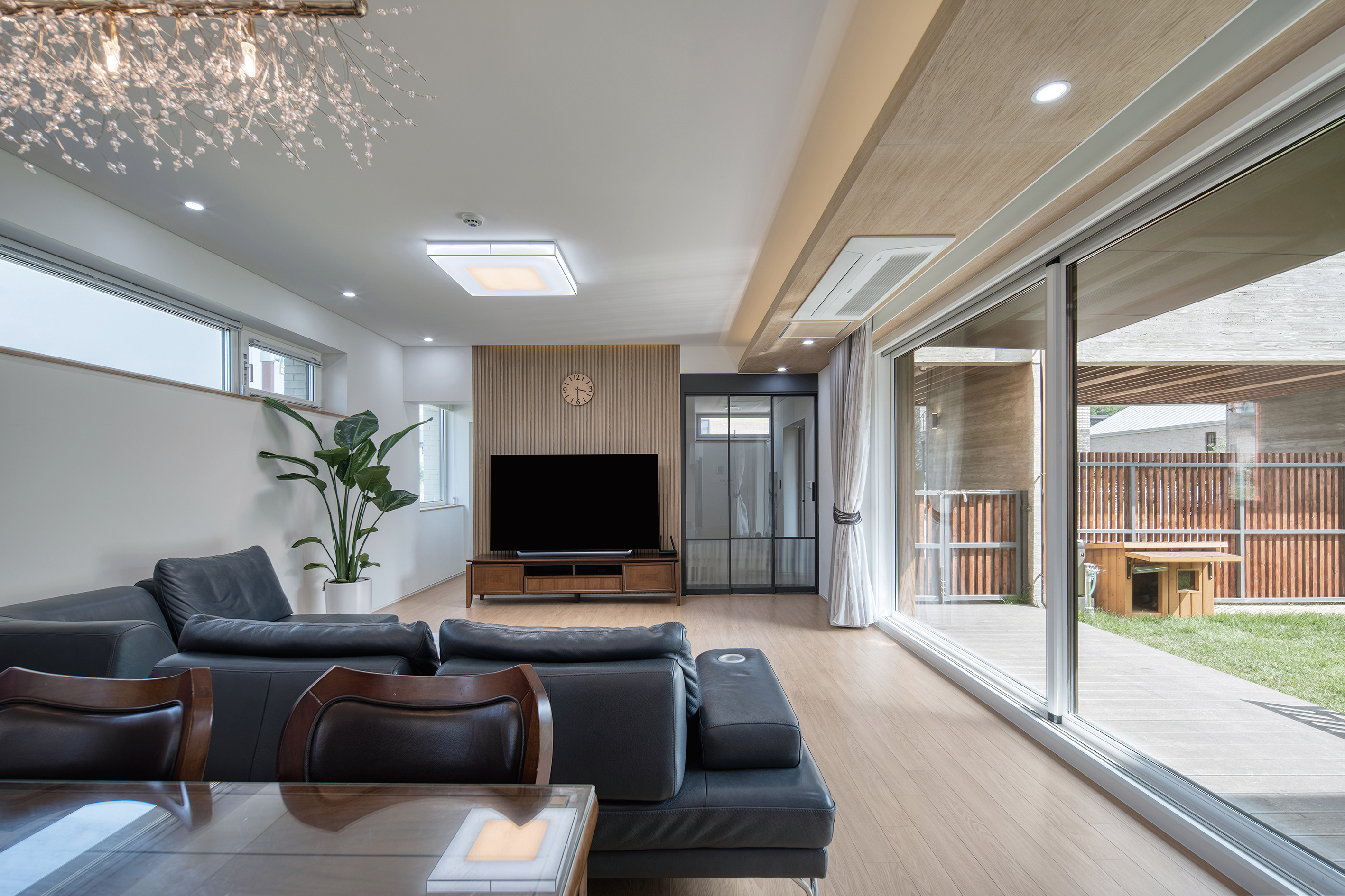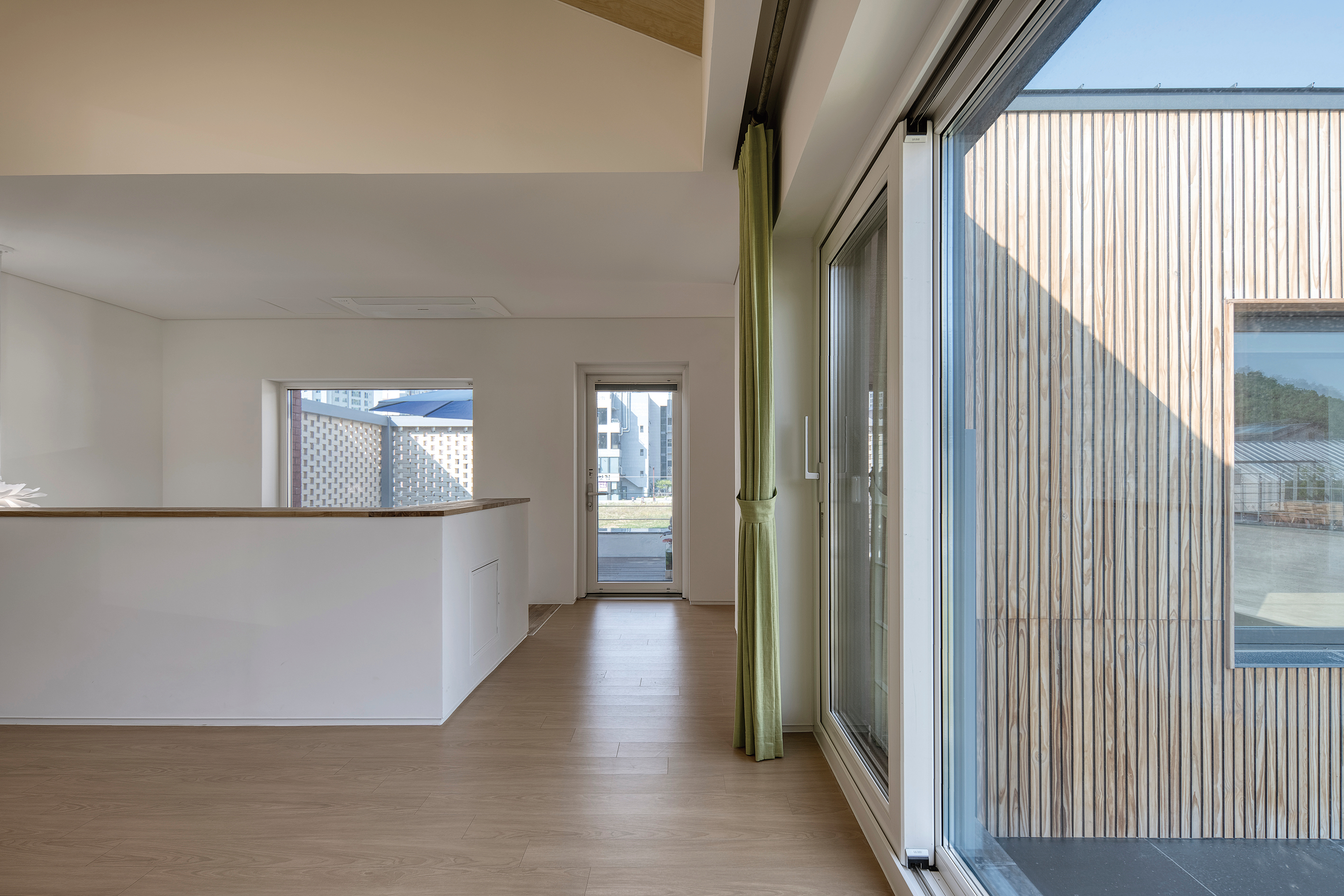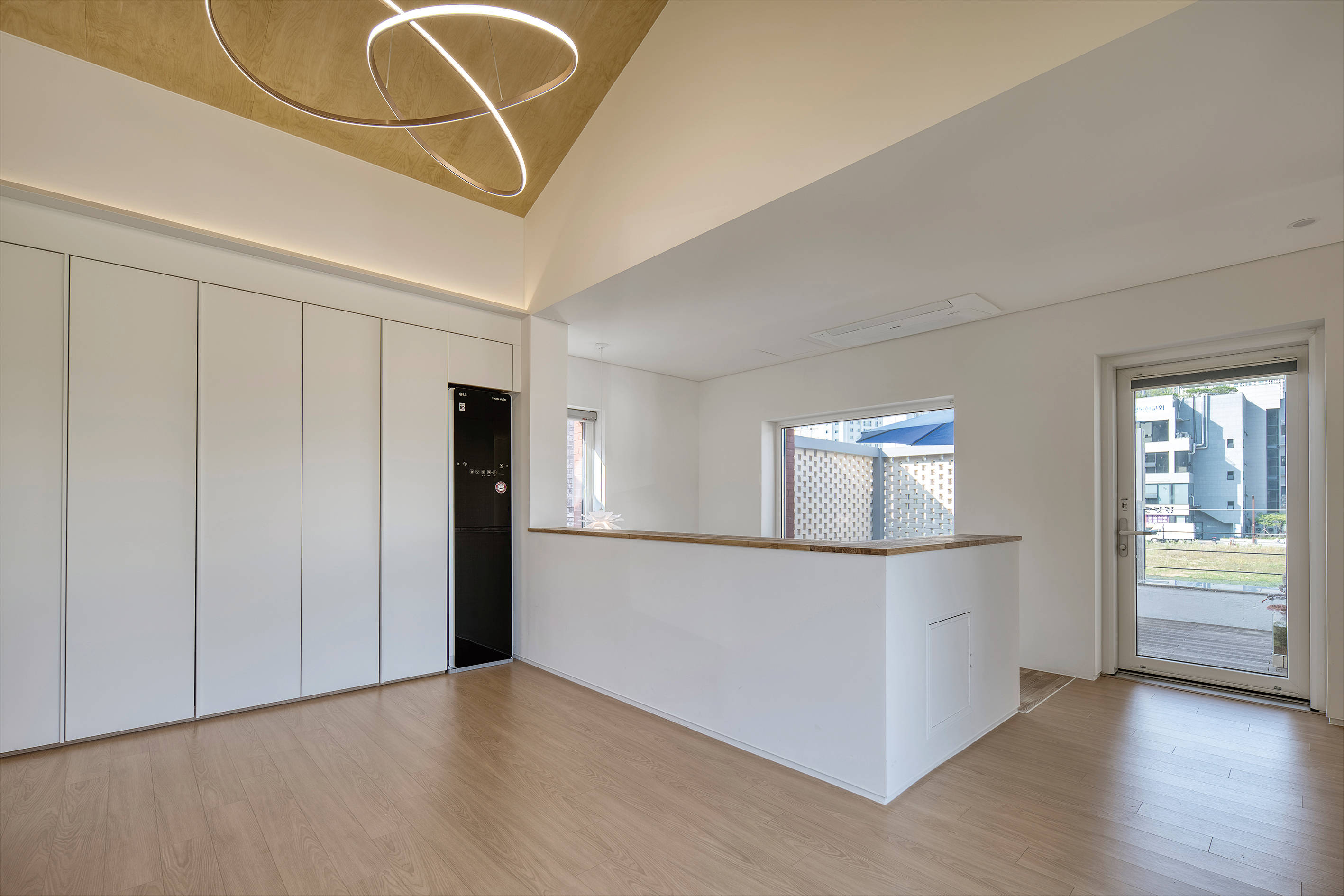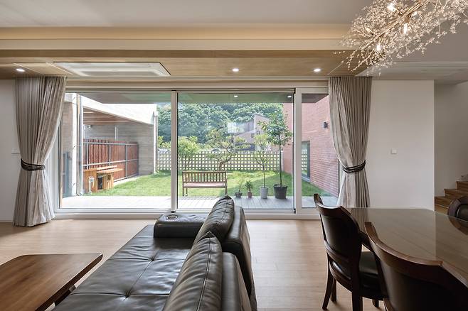 주차장을 지나 현관에 들어서면 높은 코너창을 통해 하늘을 볼 수 있다. 현관을 지나 거실에 들어서면 통창을 통해 마당과 거실이 유입되거나 확장된다. 마당으로 열린 거실에서는 계절과 시간의 흐름을 느끼며 편안함을 즐길 수 있도록 했다.