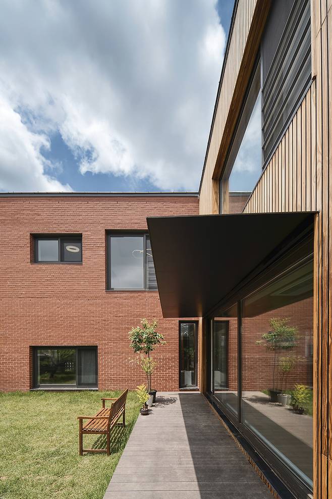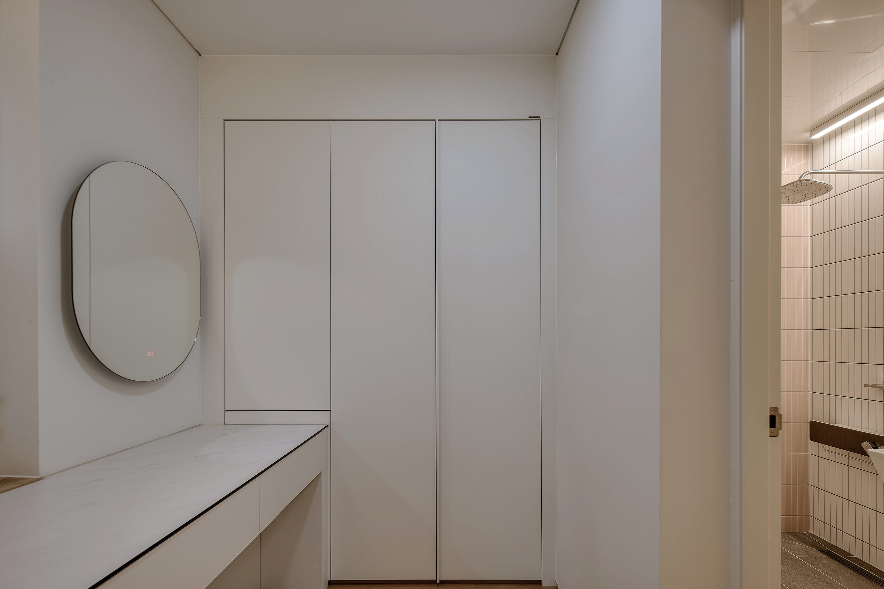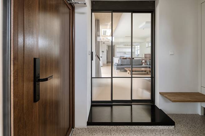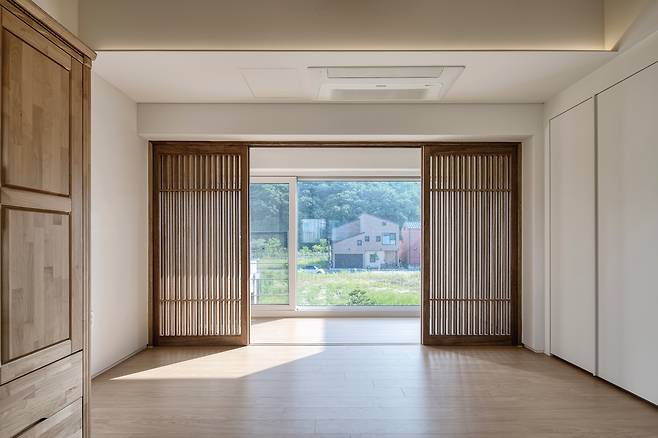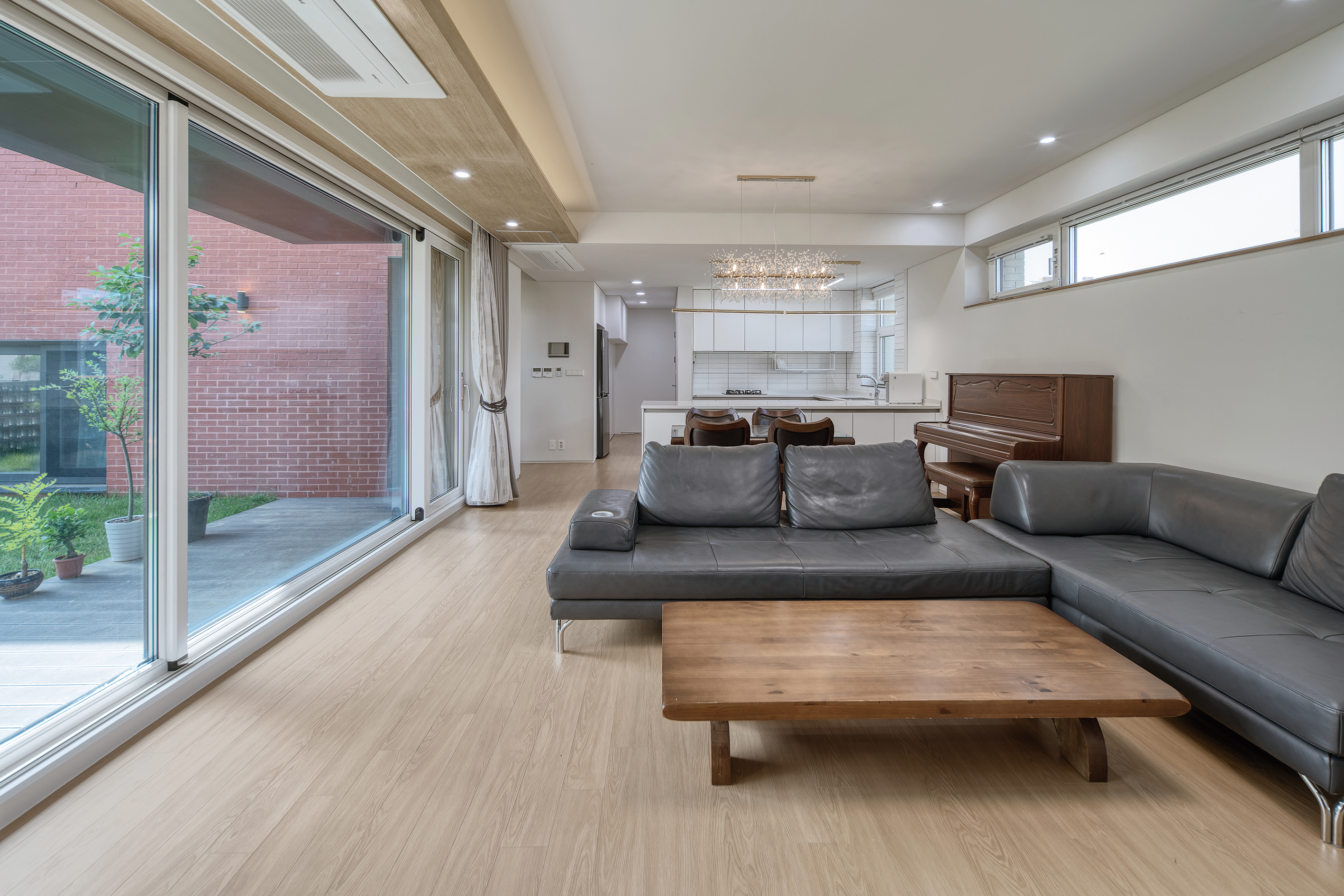 주차장을 지나 현관에 들어서면 높은 코너창을 통해 하늘을 볼 수 있다. 현관을 지나 거실에 들어서면 통창을 통해 마당과 거실이 유입되거나 확장된다. 마당으로 열린 거실에서는 계절과 시간의 흐름을 느끼며 편안함을 즐길 수 있도록 했다.