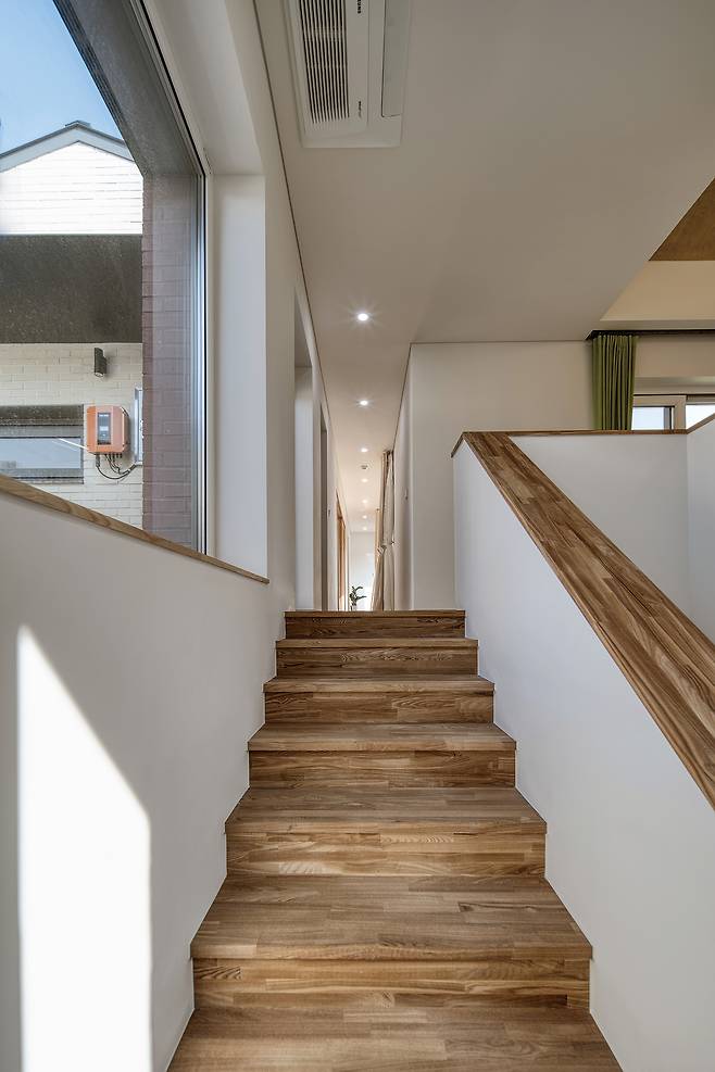 대부분 편의성을 고려해 2층으로 올라가는 계단은 현관 가까이 두지만, 이 집은 계단을 깊은 곳에 두어 오고가며 서로 마주칠 수 있는 기회를 더 가질 수 있도록 했다. 지구단위지침에 따른 박공지붕 덕분에 2층은 높은 층고가 확보되어 개방감을 느낄 수 있다.