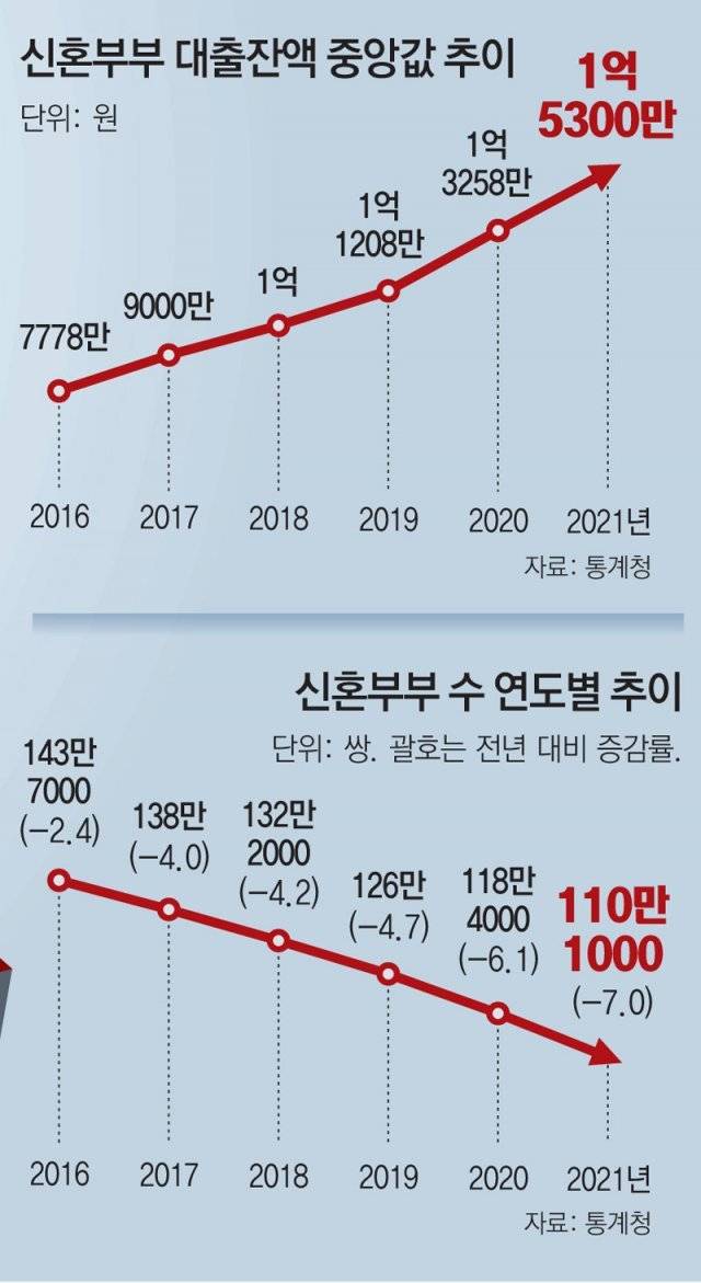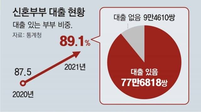 지난해 초혼 신혼부부의 대출 보유 비중이 89.1%로 높아져 2015년 관련 통계 작성 이래 가장 높은 수준인 것으로 나타났다. 이들이 빌린 대출잔액 중간값도 1억5300만 원으로 역대 최고(最高)였다. 지난해 집값이 급등하면서 신혼부부들의 ‘영끌(영혼까지 끌어모아) 대출’이 늘어난 데 따른 것이다. 집값 부담이 커지면서 지난해 신혼부부 수가 전년보다 7.0% 줄어 역대 최대 감소 기록을 갈아 치웠다.