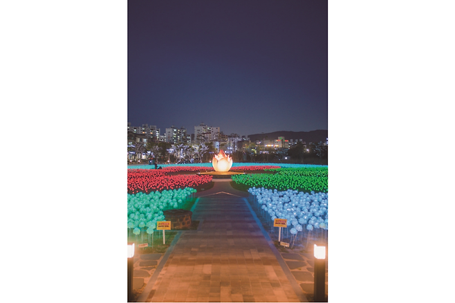 일몰 시간이 다가오면 황성공원으로 가야 합니다. ‘빛누리정원’에서 펼쳐지는 빛의 향연을 감상하기 위해서입니다. 빛누리정원은 2020년 12월에 문을 연 국내 최대 규모의 발광다이오드(LED)테마꽃정원입니다. 4920㎡ 면적에 커다란 연꽃 조형물을 중심으로 LED 장미 1만 405송이와 LED 수국 1만 5780송이가 설치돼 있습니다. 꽃들의 향연은 일몰 후 시작됩니다. 클래식, 가곡, 가요에 맞춰 장미와 수국 색이 달라지는 라이트쇼가 펼쳐집니다. 향기 없는 꽃이라도 누구나 반할 만한 장관입니다.