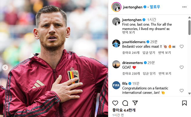 또 하나의 별이 진다. 베르통언은 2007년 6월 A매치 첫 출전을 기록한 후 17년여 동안 157경기에 나선 명실상부 레전드다. 벨기에 1위는 물론 전 세계를 통틀어도 베르통언보다 많은 경기를 소화한 선수가 없다시피 하다.