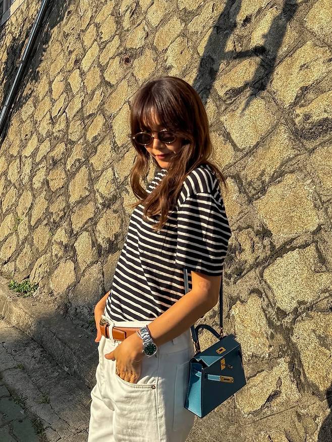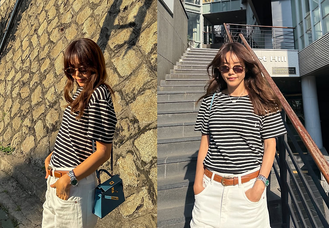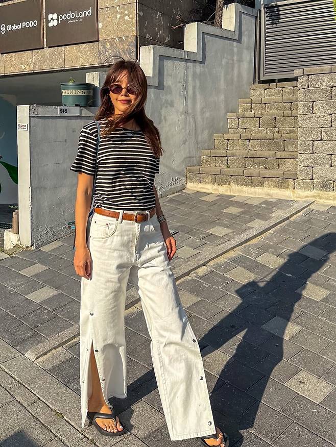 사진 속 그는 스트라이프 반팔 티셔츠와 옆트임 디테일이 돋보이는 화이트 와이드 팬츠, 그리고 갈색 레더 벨트로 포인트를 준 세련된 썸머 캐주얼룩을 선보였다.