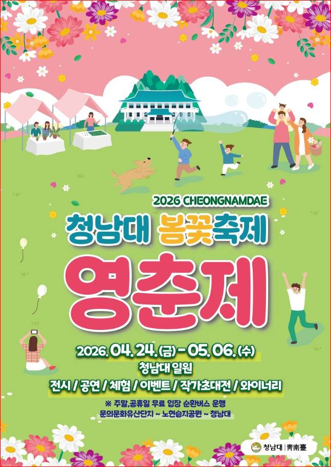 4월 말부터 5월 초까지 청남대는 봄의 절정을 보여줍니다. 올해 영춘제 기간에는 팬지, 비올라, 데이지, 마가렛 등 3만 5000여 송이의 봄꽃이 식재되어 정원 전체가 거대한 꽃밭으로 변합니다. 특히 대청호의 푸른 물빛과 꽃길이 함께 어우러지는 풍경은 청남대만의 특별한 장면입니다.