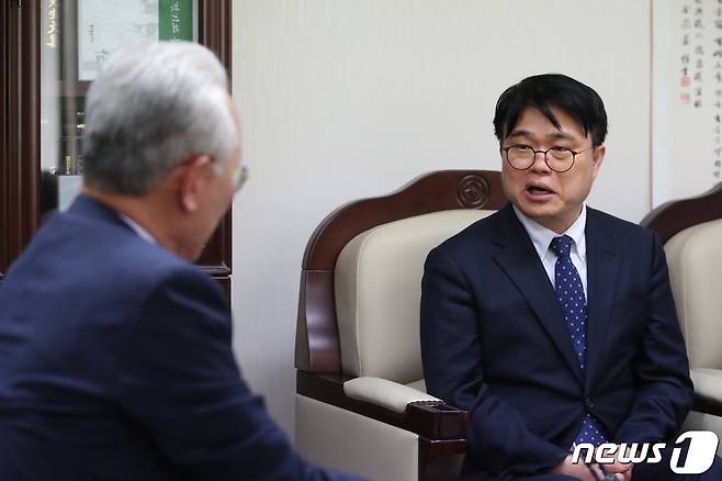 (서울=뉴스1) 이승배 기자 = 임현택 대한의사협회 회장 당선인이 8일 오후 서울 종로구 유림회관을 찾아 최종수 성균관장을 예방하고 있다. 2024.4.8/뉴스1