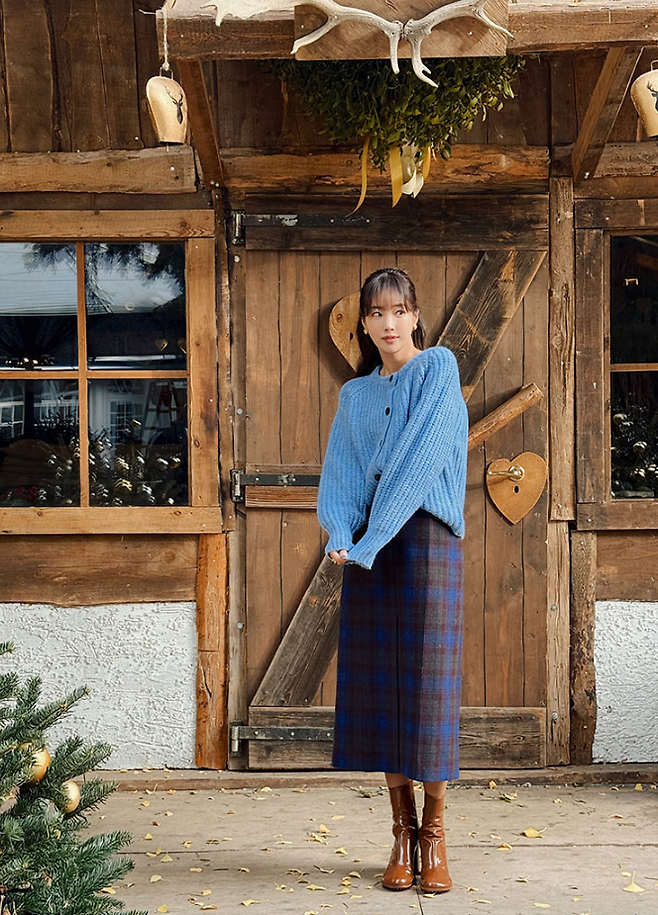 체크 패턴의 스커트와 브라운 부츠가 조화를 이루어 계절감 있는 따뜻한 룩을 완성했고, 기은세 특유의 우아하고 세련된 매력이 묻어나옵니다.