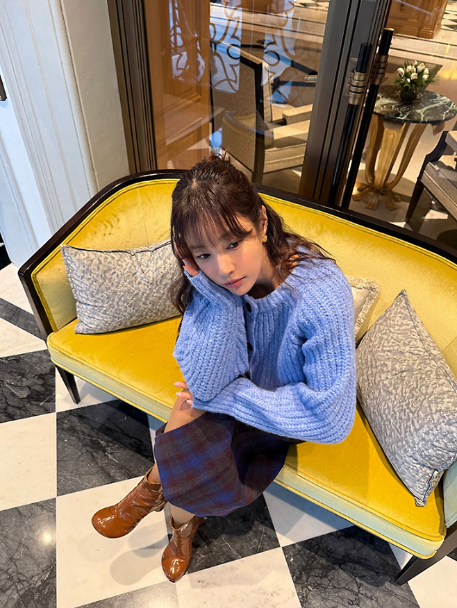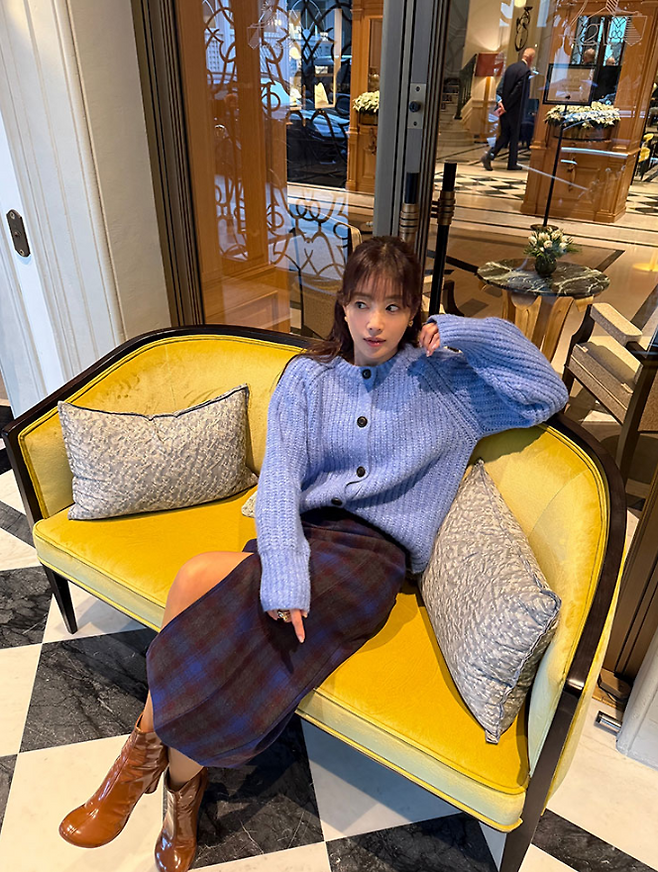 그녀의 인스타그램에 올라온 사진에서도 고급스러운 호텔 라운지에서 여유를 만끽하며 한껏 분위기를 뽐내고 있습니다. 매력적인 이쁜 가디건과 함꼐 말이죠.