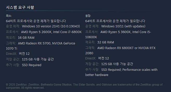<엘더스크롤 4 : 오블리비언 리마스터> 개발사 권장 사양 (보통~높음 프리셋)
