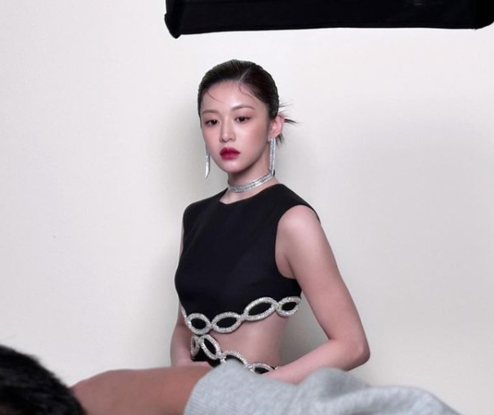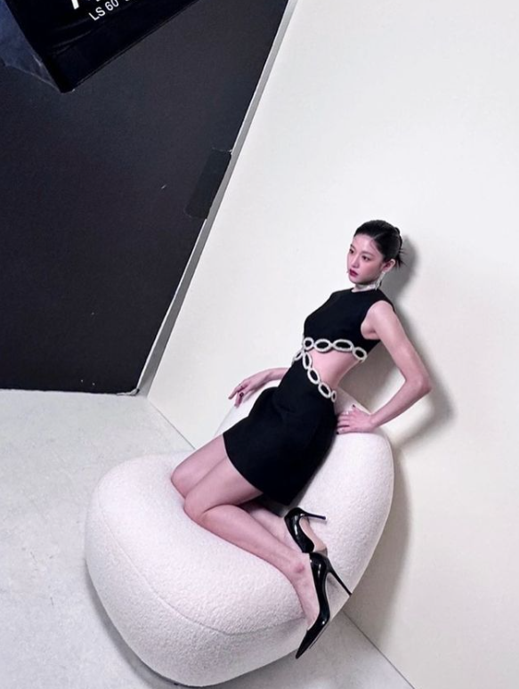 고윤정은 허리 절개가 포인트가 되는 미니드레스를 착용했다.