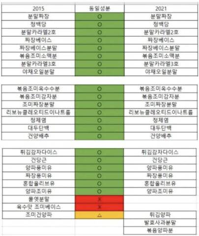 하지만, 실제로 2014년부터는 감칠맛을 담당하던 표고버섯 풍미유와 건더기들이 스프에서 빠져버리고