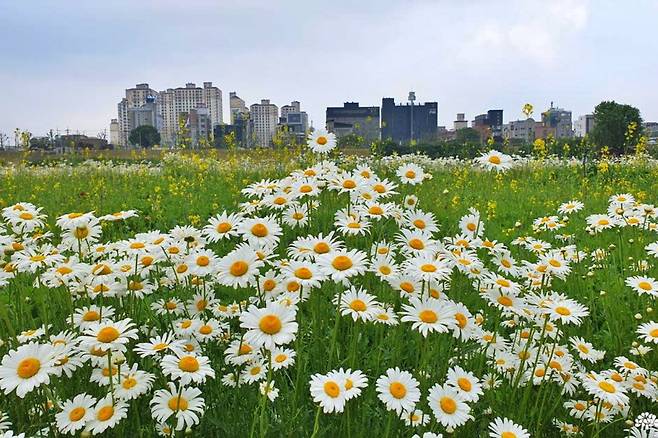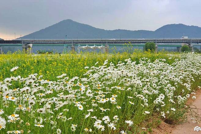 도심 속에서 만나는 봄꽃과 고즈넉한 산성의 조화. 충청남도 공주시 금강신관공원 내 ‘미르섬’이 5월을 맞아 샤스타데이지로 하얗게 물들었다. 공산성을 배경으로 펼쳐진 이 꽃밭은 시민과 여행객 모두에게 완연한 봄기운을 선물하고 있다.