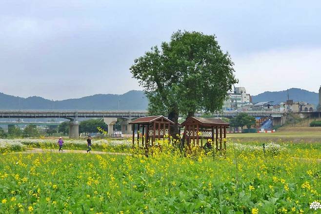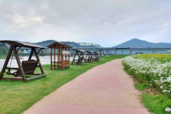 물가 주변에는 샤스타데이지 외에도 유채꽃, 양귀비, 보라색 들꽃이 자연스럽게 자라나며 풍경을 더욱 다채롭게 만든다. 특히 양귀비는 인공 조성보다는 자연 자생에 가까운 모습으로, 보는 이에게 생태적 감성을 더한다. 금강 방향으로는 흔들의자 쉼터도 마련돼 있어 강바람을 맞으며 쉬기 좋다.
