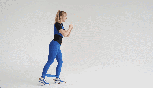 네발기기 자세로 시작합니다. 다리 사이에 저항 밴드를 착용합니다. 왼쪽 다리를 뒤로 뻗으며 무릎을 완전히 펴서 킥 동작을 수행합니다. 다리를 바꿔 반대쪽 다리로도 동일하게 반복합니다.