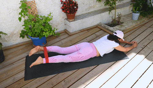 다리에 밴드를 끼운 상태로 바닥에 엎드립니다. 다리를 공중으로 살짝 들어 올려 바닥에 닿지 않도록 유지합니다. 다리를 좌우로 벌린 후 다시 오므립니다. 이 동작을 반복하세요.