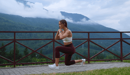 손을 가슴 앞에서 모아 잡고 서 있습니다. 왼발을 앞으로 뻗으며 무릎을 90도로 구부려 런지 자세를 만듭니다. 오른발을 앞으로 당겨서 뻗으며 다시 런지 동작을 수행합니다. 이 과정을 반복하며 전진합니다.