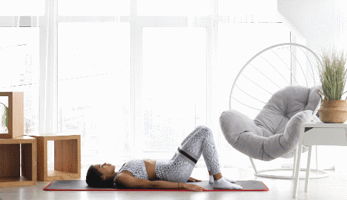 매트에 누운 상태에서 다리 사이에 저항 밴드를 착용합니다. 무릎을 당겨 세우고, 발은 바닥에 붙여 고정합니다. 엉덩이를 들어 올려 브릿지 자세를 만듭니다. 이 상태에서 다리를 벌렸다가 오므리는 동작을 수행합니다.