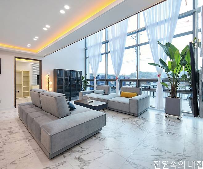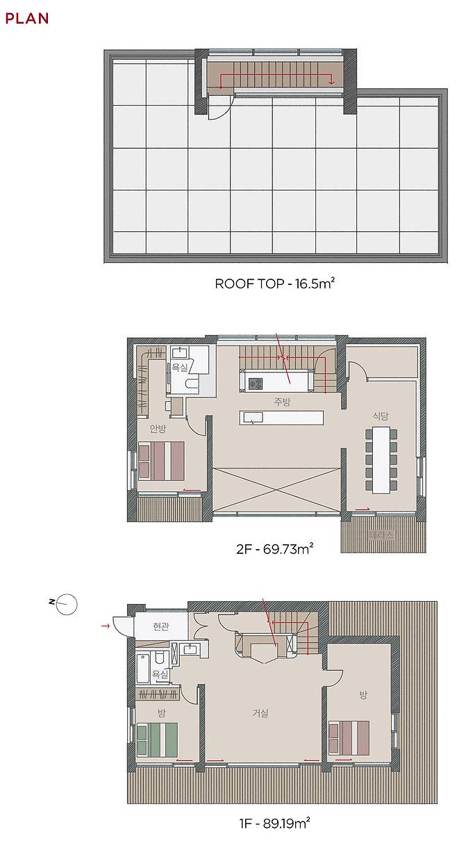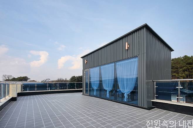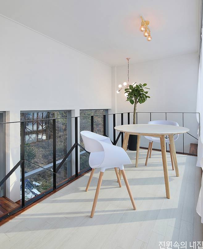 우측면의 현관을 통해 실내로 들어서면 천장이 오픈된 거실을 만나게 된다. 거실의 전면은 오픈된 천장을 통해 7m에 달하는 높이 전부를 창으로 적용했는데, 덕분에 웅장한 공간감에 더해 풍부한 채광으로 실내를 밝게 채운다. 1층 거실 좌우로 침실과 서재, 욕실, 세탁실 등이 자리했다. 주방은 계단을 올라 2층에 배치되었다. 손님을 맞는 공적인 성격의 1층 대신, 프라이버시를 신경 쓴 부분이 엿보인다. 한 층 위로는 루프탑 공간이 넓은 옥상 테라스와 함께 자리해 활용도 높은 외부공간으로 자리했다.