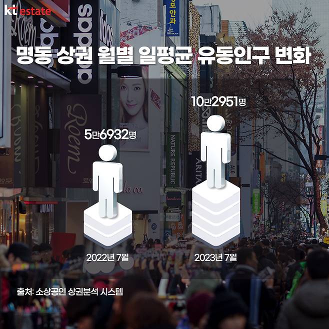 현재 명동 상권이 부활한 원인으로는 코로나 엔데믹 이후 유동 인구 증가를 들 수 있습니다. 소상공인 상권분석 시스템에 따르면, 명동 상권의 월별 일평균 유동인구는 지난해 하반기부터 서서히 증가하기 시작해 올해 5월에는 10만 명을 돌파했습니다. 7월 기준으로 유동인구는 10만2951명으로 전월(10만5706명)보다 소폭 감소했지만, 전년 동기(5만6932명)보다는 약 2배 증가했습니다.