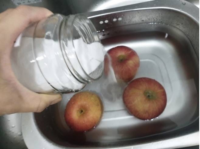 찬물에 베이킹소다를 넣고 5분~10분 정도 사과를 담갔다가 세척해 주세요