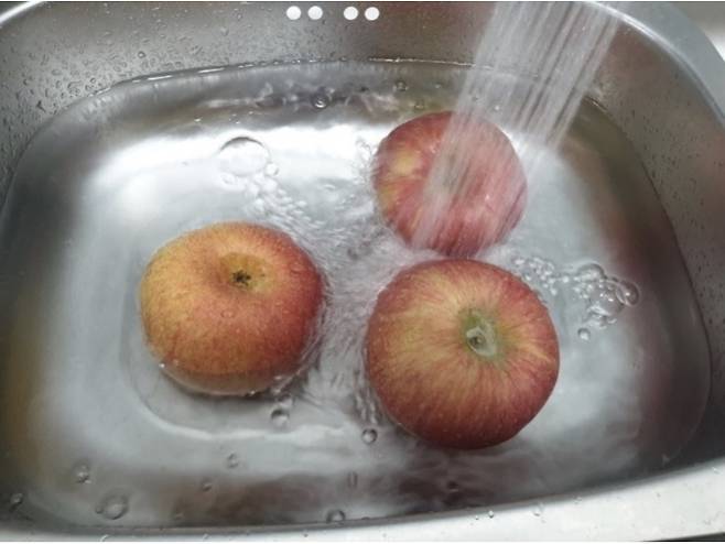 먼저 사과를 흐르는 물에 한번 씻어주세요