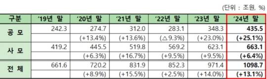 17일 금융투자협회 ‘2024년 펀드시장 결산’에 따르면 지난해 12월 말 기준 펀드 순자산총액은 1,098조 7천억 원으로 전년 대비 127조 3천억 원(13.1%) 증가했다.
