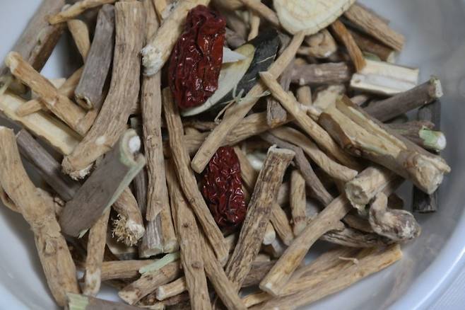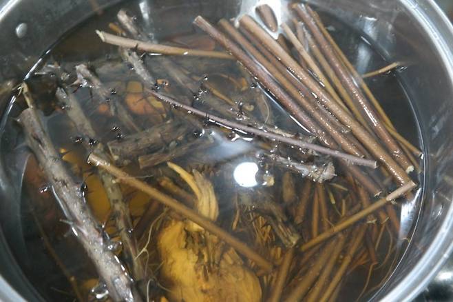 토종닭 백숙에는 다양한 약재를 넣어 효능을 높일 수 있습니다. 저는 황기, 오가피, 헛개나무, 천궁, 녹각, 당귀, 대추 등의 한약재를 삼베 주머니에 넣어 함께 끓였습니다. 또한, 마늘, 인삼, 생밤, 대추는 닭 뱃속에 넣어 깊은 맛을 더했습니다. 농장에서 키우는 엄나무, 오가피나무 뿌리, 뽕나무 가지, 우슬 뿌리도 넣어 풍미를 더했습니다.