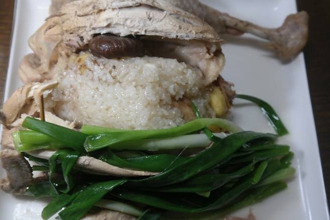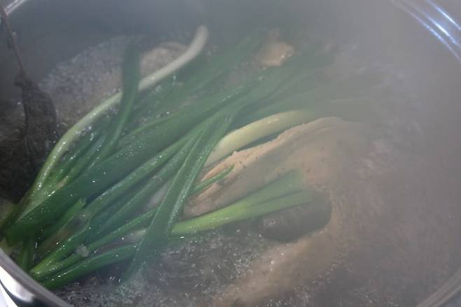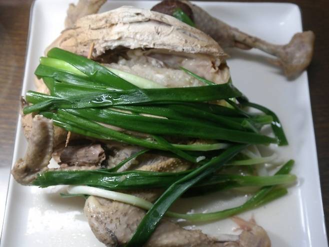 약재를 걸러낸 육수에 대파를 넣고 마무리하면 향긋한 토종닭 백숙이 완성됩니다. 토종닭은 육계에 비해 쫄깃하고 꿩고기 맛이 나는 것이 특징입니다. 특히 닭 다리와 닭 가슴살 부위에서 느낄 수 있는 풍미가 일품입니다.