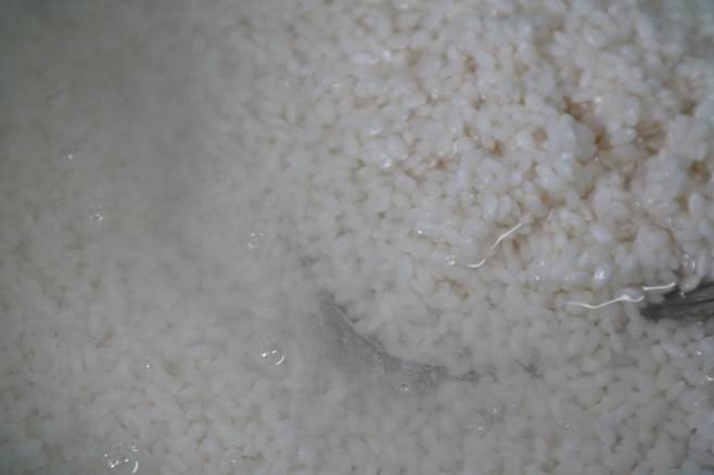 3. 냄비에 참기름을 살짝 두르고 불린 쌀을 볶아줍니다.