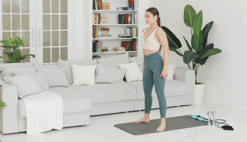 다리를 벌리고 매트에 서서 시작합니다. 무릎을 구부리며 엉덩이를 낮춰 스쿼트 동작을 수행합니다. 팔은 스쿼트 시 가슴 앞으로 당겼다가, 일어설 때 옆구리로 이동합니다.