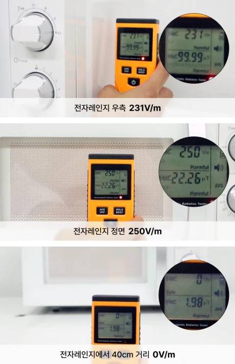 실제로 판매되는 제품은 전자파 안전 기준을 통과한 제품으로 문제가 없습니다. 하지만 측정기준이 보통 30cm 이상 떨어진 곳이므로 가까이서 내부를 확인하는 것은 삼가는 것이 좋습니다.